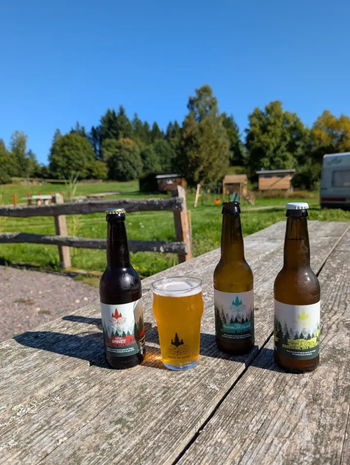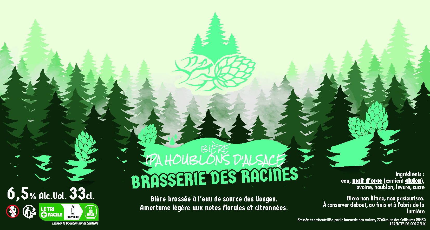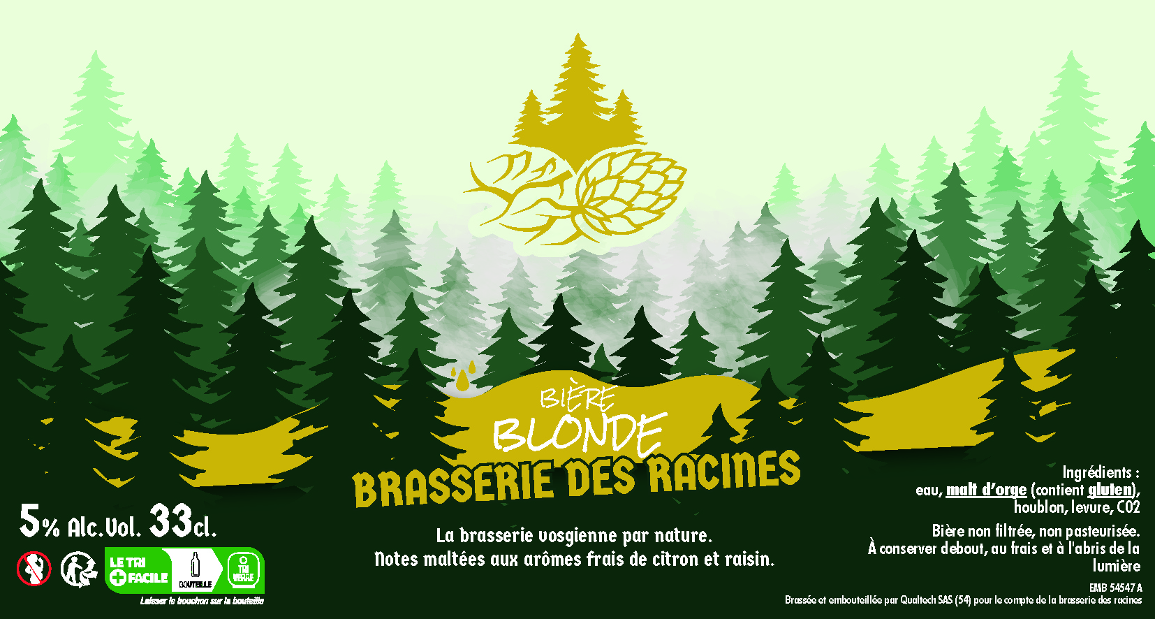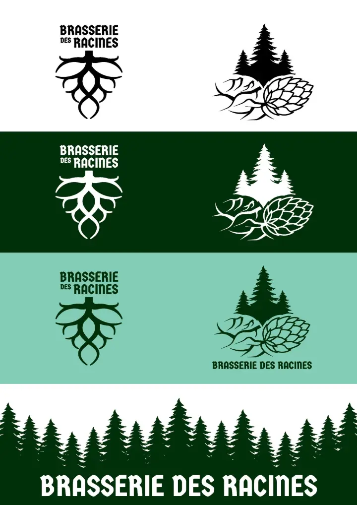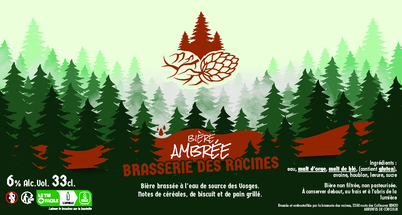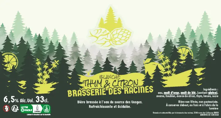 Pour les étiquettes, c'est une trame avec 4 déclinaisons de couleurs au niveau du logo et du bandeau en fonction du type de bière. L'esprit reste le même que celui du logo en mettant l'accent sur la forêt.
