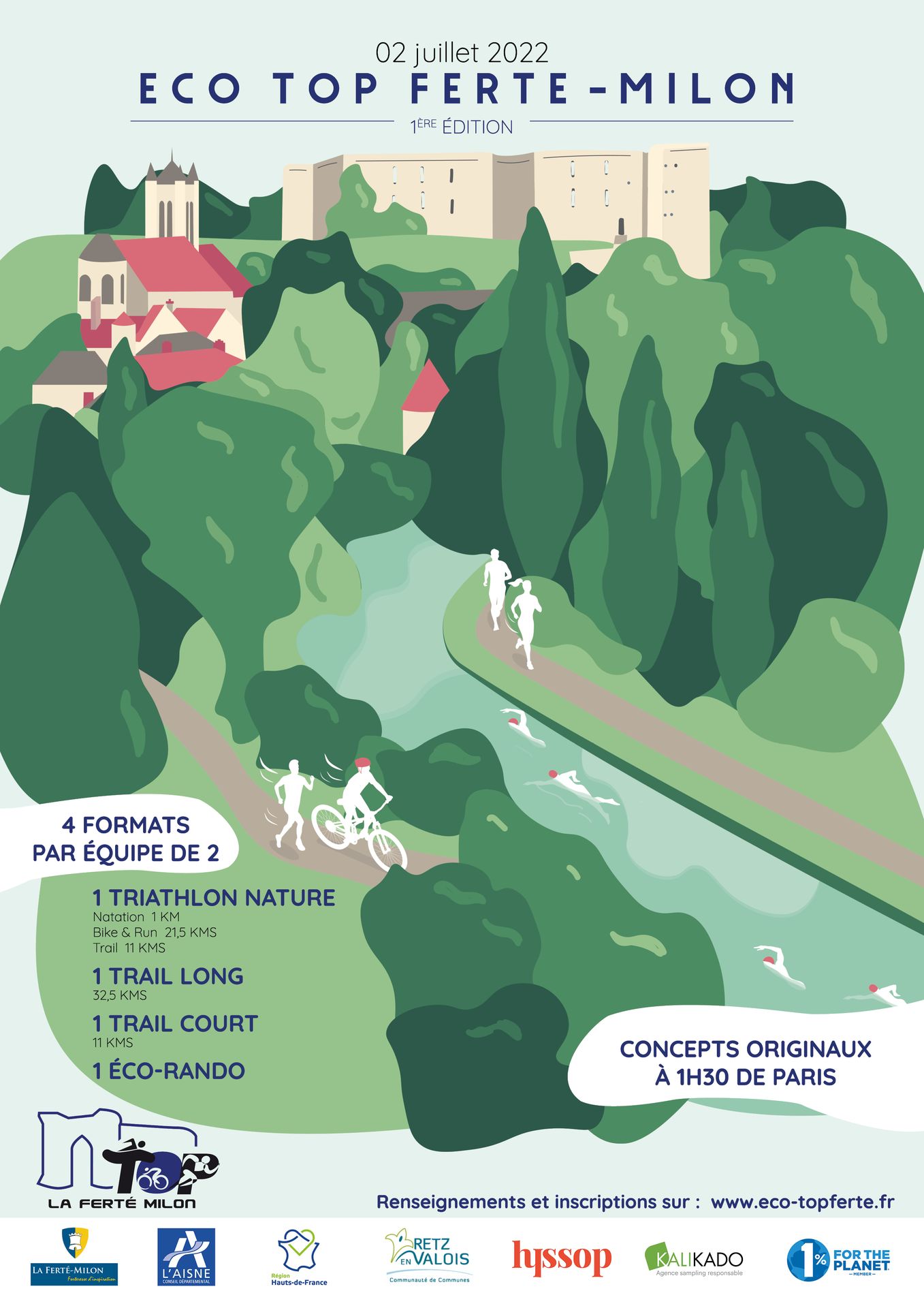 Pour cette affiche on m'a demandé de créer une illustration reprenant les éléments fort de cet événement, le lieu, le village de la Ferté-Milon, avec son château et son cours d'eau. Enfin il fallait surtout mettre en avant la course triathlon, avec la nage, la course et le vélo.