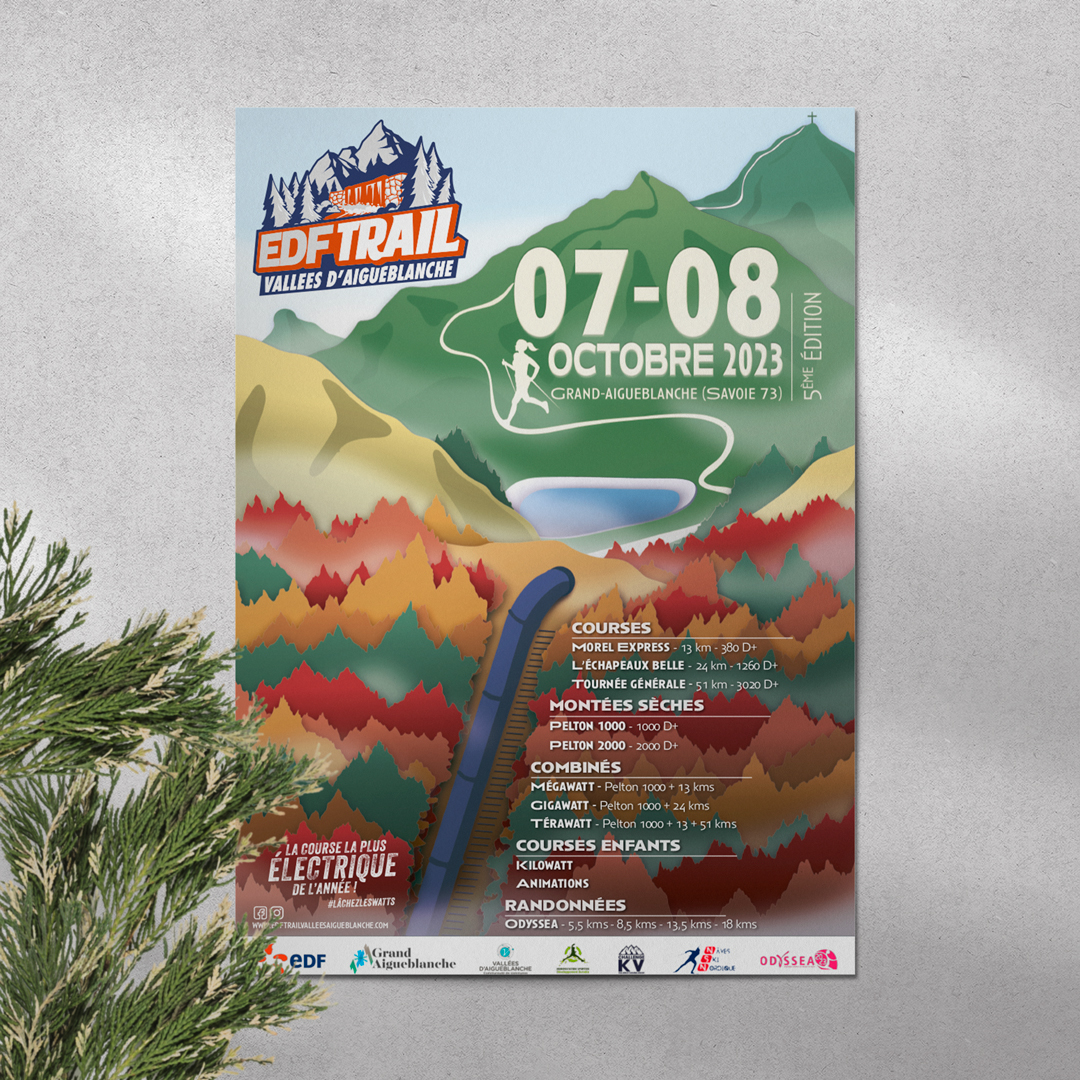 Pour l'EDF Trail 2023, le focus de l'illustration se fait sur l'iconique tuyau de la centrale hydroélectrique EDF de La Coche, qui s'avère faire partie du trail.